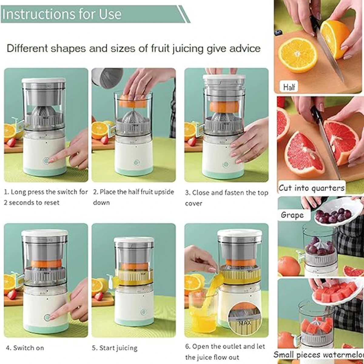 6. لطفاً میوه را از قبل نصف یا کوچکتر کنید تا از گیر کردن میوه جلوگیری شود. در حین استفاده نیازی به اتصال به برق نیست. پس از شارژ کامل از آن استفاده کنید و هنگام شارژ از آن استفاده نکنید. 1.5 تا 2 ساعت طول می کشد تا شارژ شود و هنگامی که به طور کامل شارژ شود، چراغ نشانگر از قرمز به سفید تبدیل می شود.